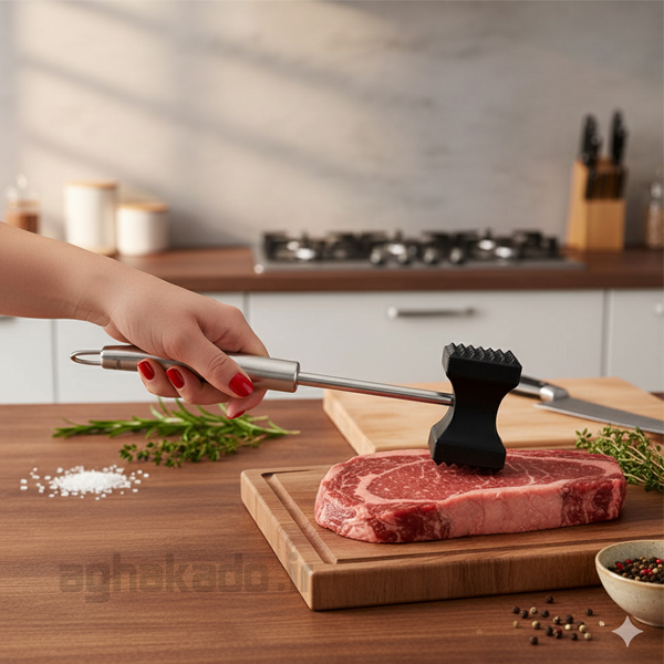 دسته ارگونومیک: طراحی دستهی آن به گونهای است که کوبیدن گوشت را بدون خستگی و با حداقل فشار ممکن میسازد و به آسانی در دست جا میگیرد.