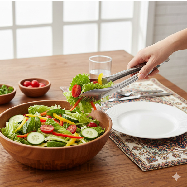 * شکل منحنی و هلالی این انبرها و چنگکهای درشت و بلند، امکان برداشتن مقدار مناسبی از سالاد (مانند سالاد سزار، سالاد الویه یا سالاد شیرازی) و انتقال منظم آن به بشقاب را فراهم میکند.